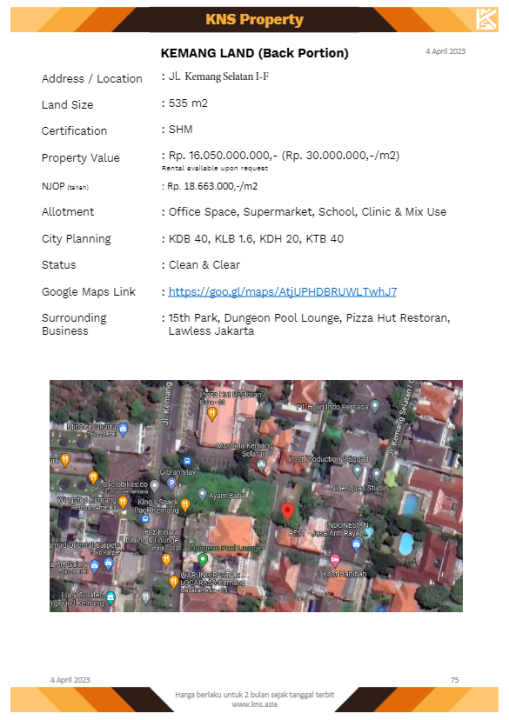 Tanah luxury di lokasi strategis Kemang, Jakarta Selatan. LT 535m², harga eksklusif 8,58 Triliun. Lokasi premium, dekat pusat bisnis dan perbelanjaan.