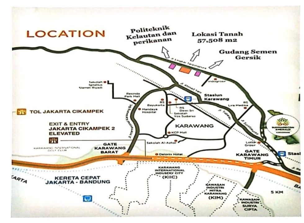 - Dari pintu Tol Karawang Barat, dapat diakses menuju ke Lokasi melalui Jl Raya International Karawang Barat, sudah ada pembangunan Perumahan Grand Taruma, Hotel ,Mall Resinda (Djarum Group), dan Rumah sakit. -+ 10 km dari Perumahan Sumarecon Emerald Karawang +- 2 km dari Pusat Center Bisnis Karawang -