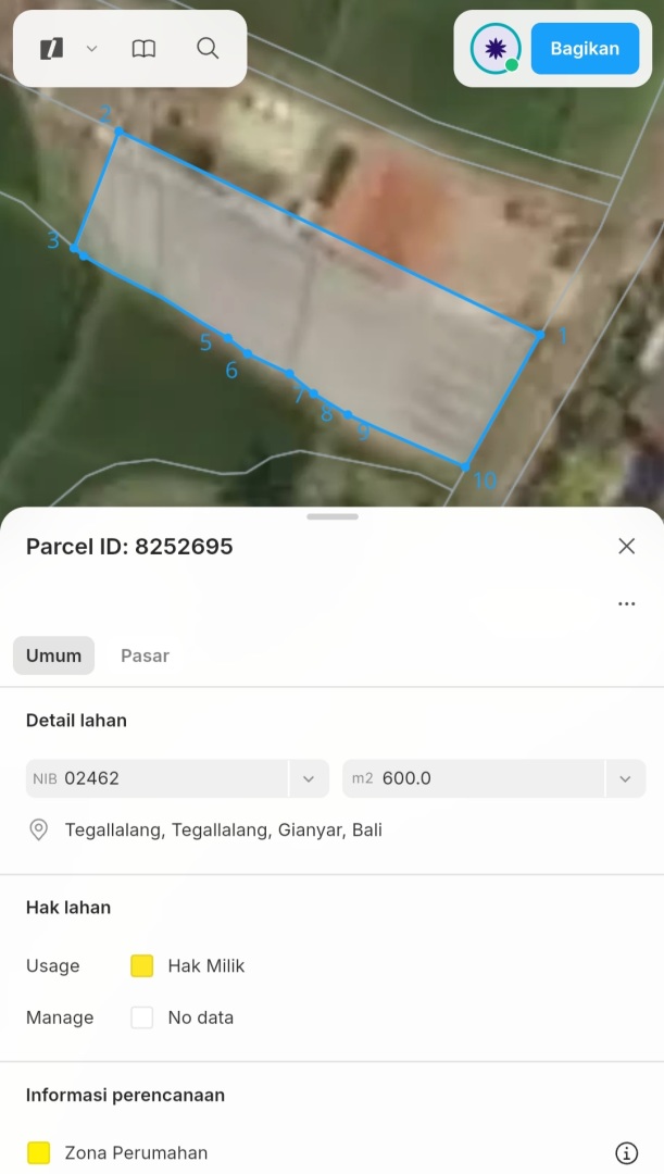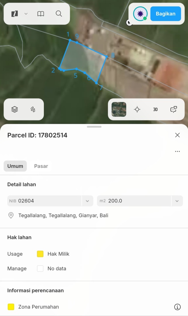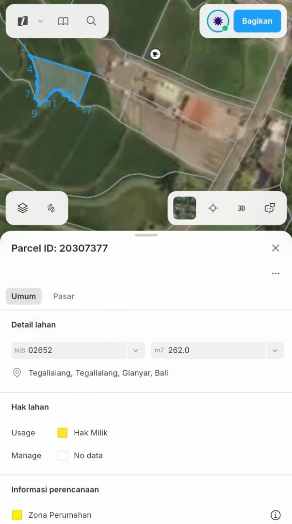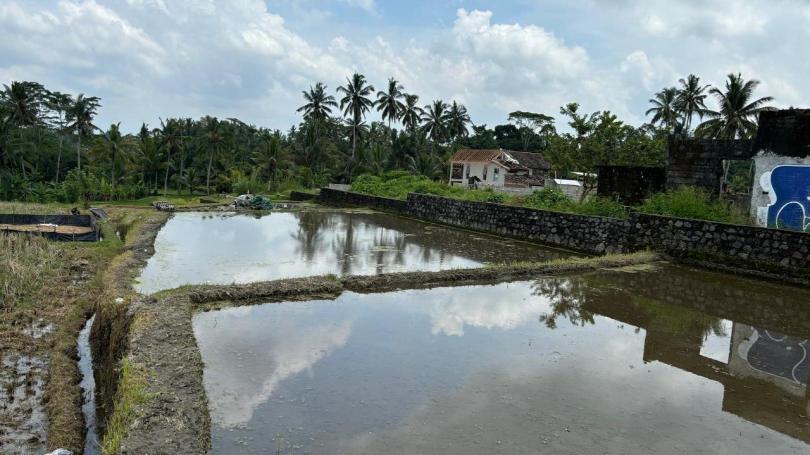 Tanah ini terdiri dari 3 shm, memiliki kontur datar di bagian depan dan terasering di bagian belakangnya. Berada di pinggir jalan aspal dengan lebar 6 meter dan dikelilingi dengan pemandangan sawah di samping dan hutan kecil di bagian belakangnya. Di sekitar tanah ini sudah ada beberapa bangunan vila dan restoran jadi sangat bagus untuk investasi jangka panjang atau vila pribadi.