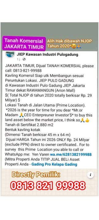 Hubungi : Yen Varen - Gading Pro.( *0813xxxxxxxx* ), Apabila ada yang bisa saya bantu terkait kebutuhan Bapak/Ibu untuk memasarkan/menjual Property yang Bapak/Ibu miliki atau juga ingin mencari lokasi properti yang diidamkan oleh Bapak/Ibu, tentunya jangan sungkan untuk memberi tahu saya, dengan senang hati saya membantu Bapak/Ibu.