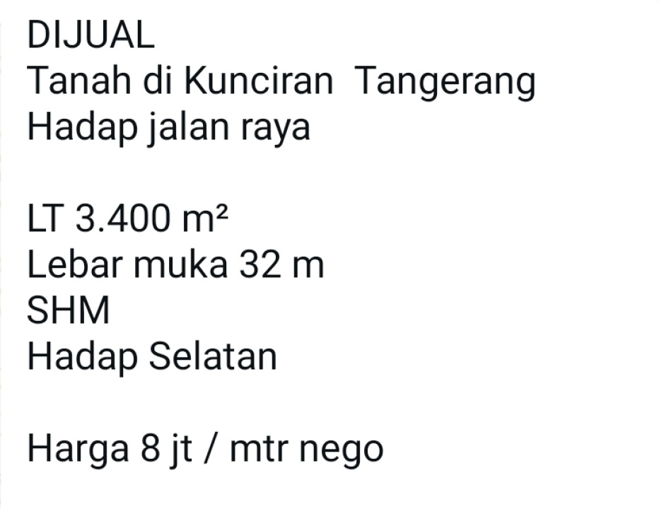 Tanah luxury di lokasi strategis Kunciran, Tangerang. LT 3400m², harga eksklusif 92,4 Triliun. Lokasi premium, dekat pusat bisnis dan perbelanjaan.