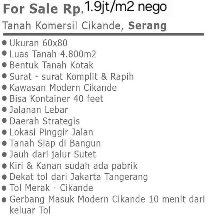 Jual Tanah Komersil Cikande Strategis Deket Pintu Tol Harga Bagus bentuk tanah kotak..konterner masuk..deket jalan tol