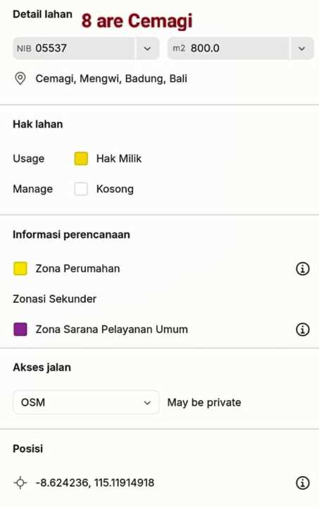 Cemagi Badung - Dijual tanah dengan LT 800 m2, dekat dari fasilitas publik, ideal untuk tempat tinggal dan buka usaha. Lokasi ramai, akses mudah, dan tidak terkena banjir.