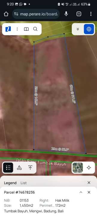 Dijual Tanah Komersial 1450m² di Jalan Utama Tumbak Bayuh Pererenan Bali.