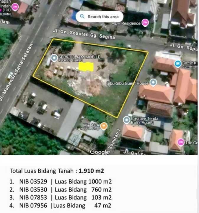 Dijual tanah murah di Mahendradata, Denpasar, luas tanah 1910m². Harga terjangkau 296 Juta, cocok untuk hunian minimalis atau investasi.