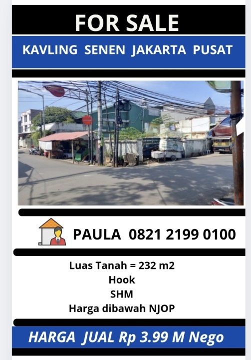 Tanah luxury di lokasi strategis Senen, Jakarta Pusat. LT 232m², harga eksklusif 4 Miliar. Lokasi premium, dekat pusat bisnis dan perbelanjaan.