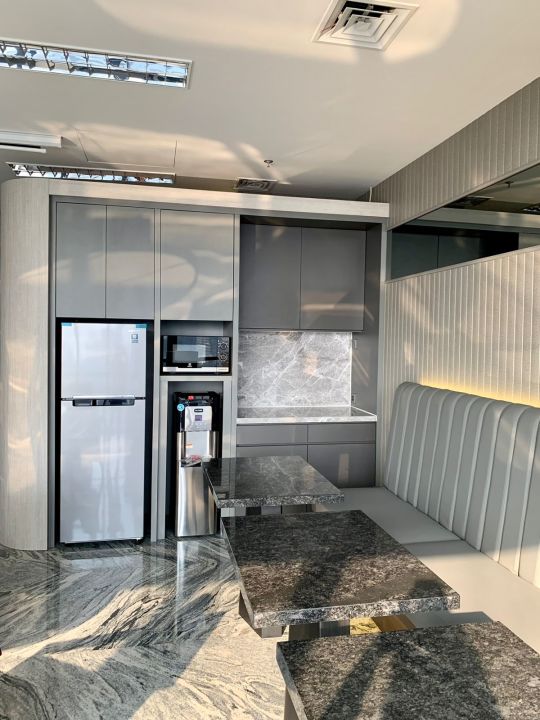 - Microwave, Refrigerator, Water Dispenser included