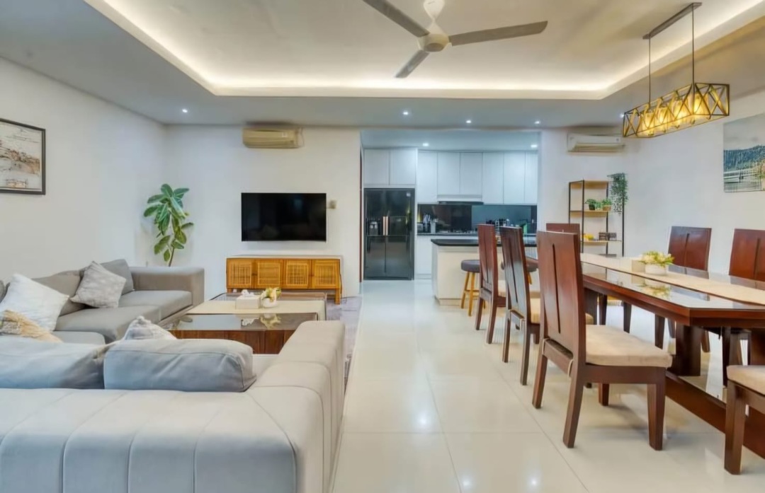 The villa features four spacious bedrooms, each with its own ensuite bathroom, air-conditioning, blackout curtains and built in wardrobes. All bedrooms and the living room are fully air-conditioned, ensuring comfort throughout the year. A maid's room is included for additional space.