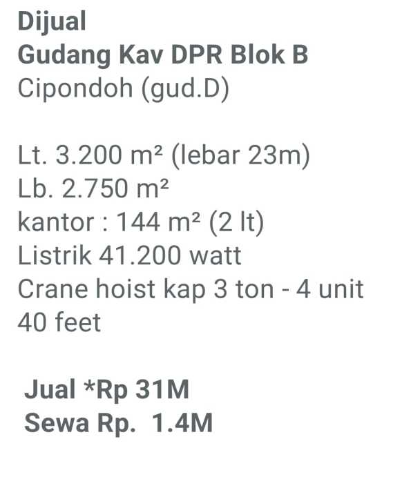 Dijual/Disewa Gudang Kavling DPR Blok B, Cipondoh, Tangerang