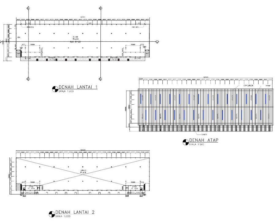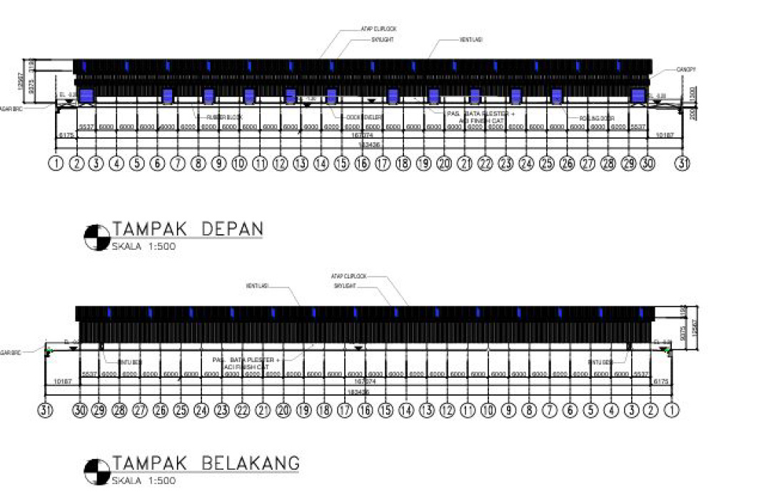 - Tinggi gudang +/- 9 m area pinggir, dan +/- 12.5 m area tengah