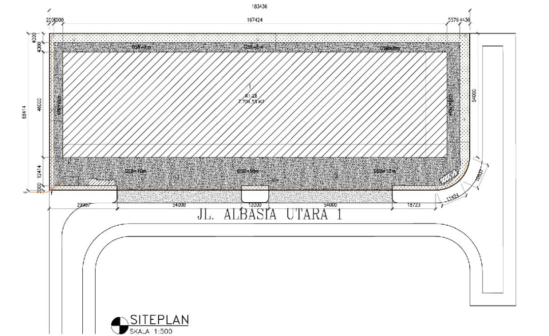 - Luas bangunan : 7.912 m2 (luas gudang 7.702 m2, +/- dimensi lebar 167 m x panjang 46 m) dan Office Mezanine 220 m2